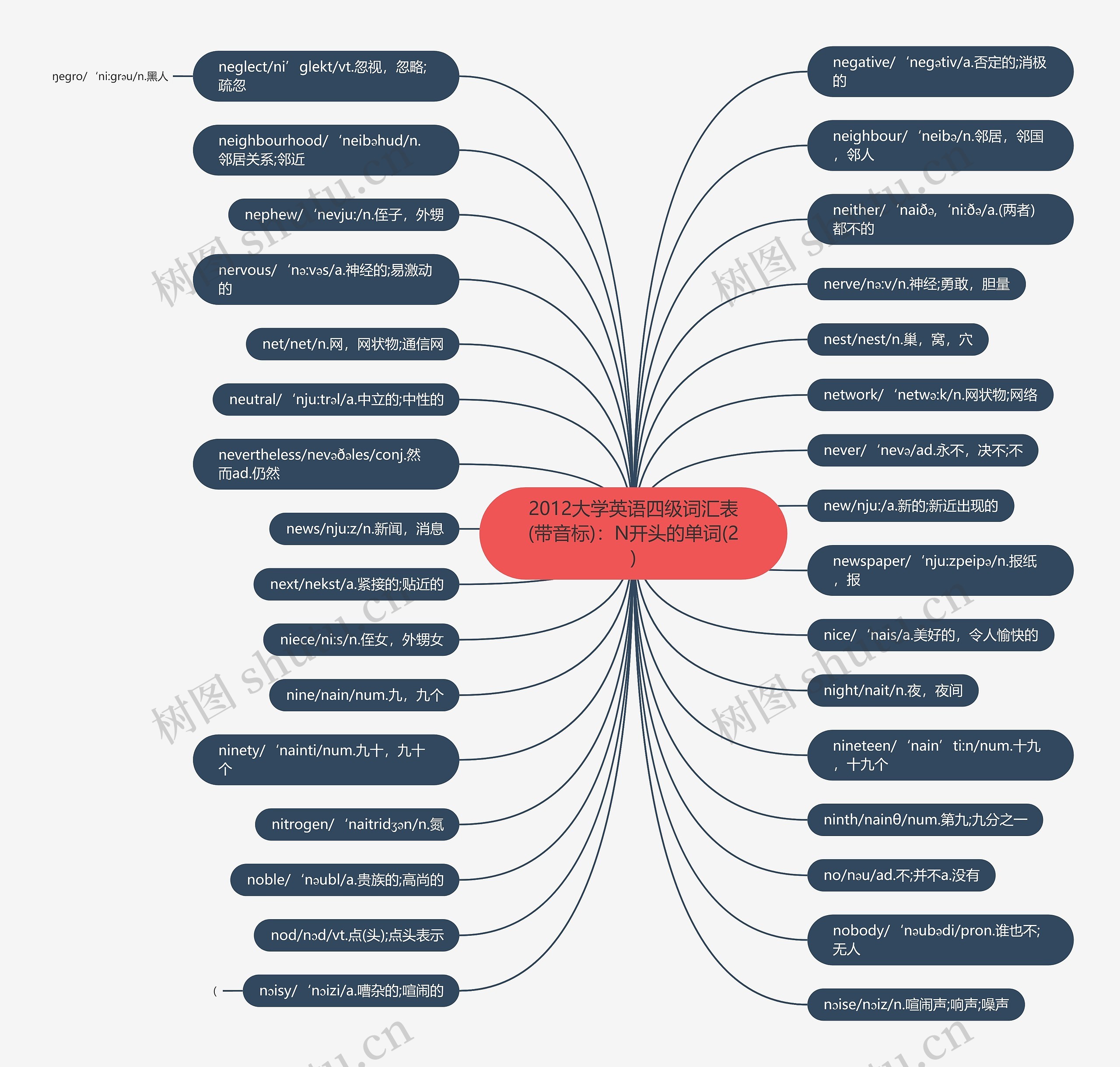 树图思维导图提供《2012大学英语四级词汇表(带音标):N开头的单词(2)》在线思维导图免费制作,点击“编辑”按钮,可对《2012大学英语四级词汇表(带音标):N开头的单词(2)》进行在线思维导图编辑,本思维导图属于思维导图模板主题,文件编号是:05c1c4b4e0752182381a7bcc616f7d9c
