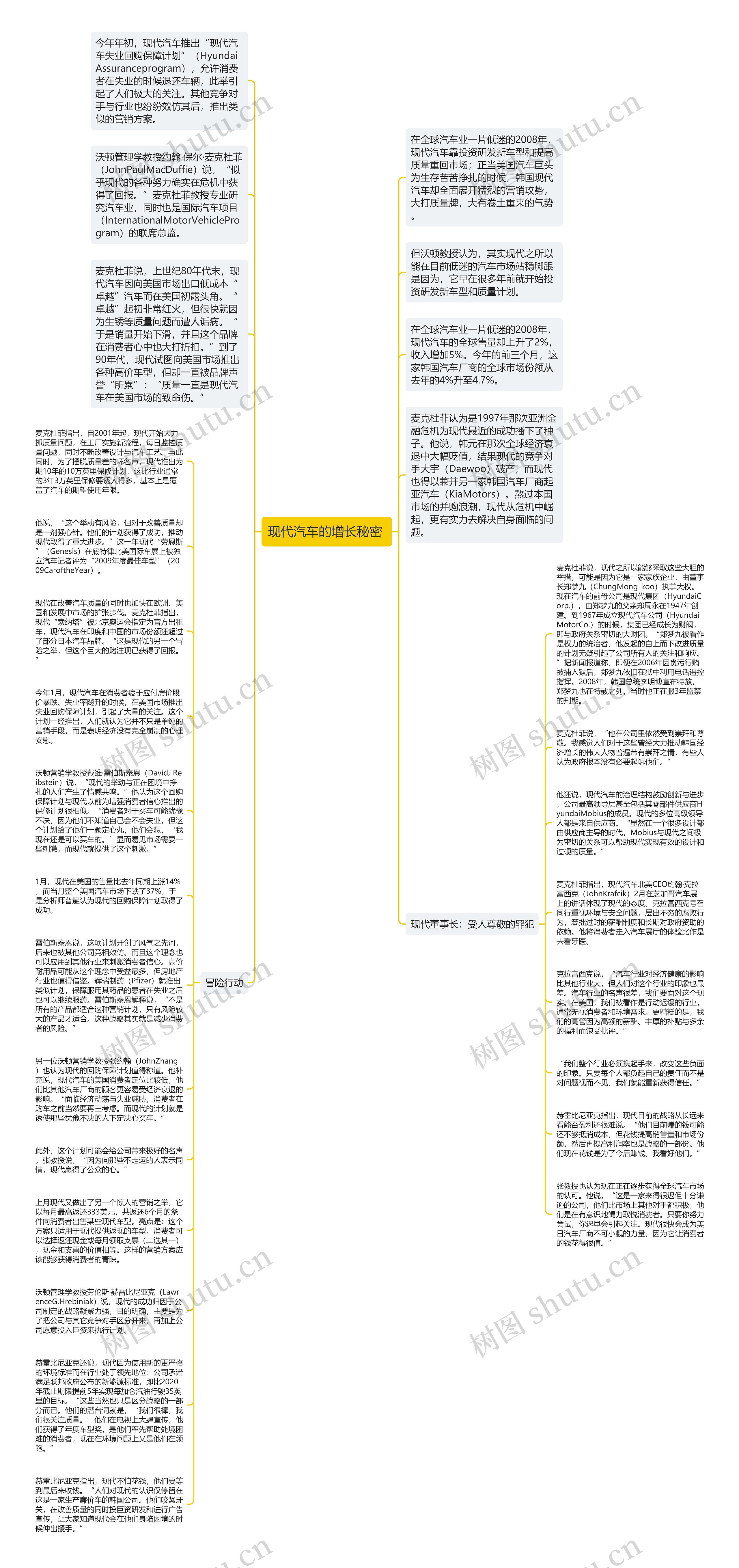 麦克杜菲指出,自2001年起,现代开始大力抓质量问题,在工厂实施新流程,每日监控质量问题,同时不断改善设计与汽车工艺。与此同时,为了摆脱质量差的坏名声,现代推出为期10年的10万英里保修计划,这比行业通常的3年3万英里保修要诱人得多,基本上是覆盖了汽车的期望使用年限。