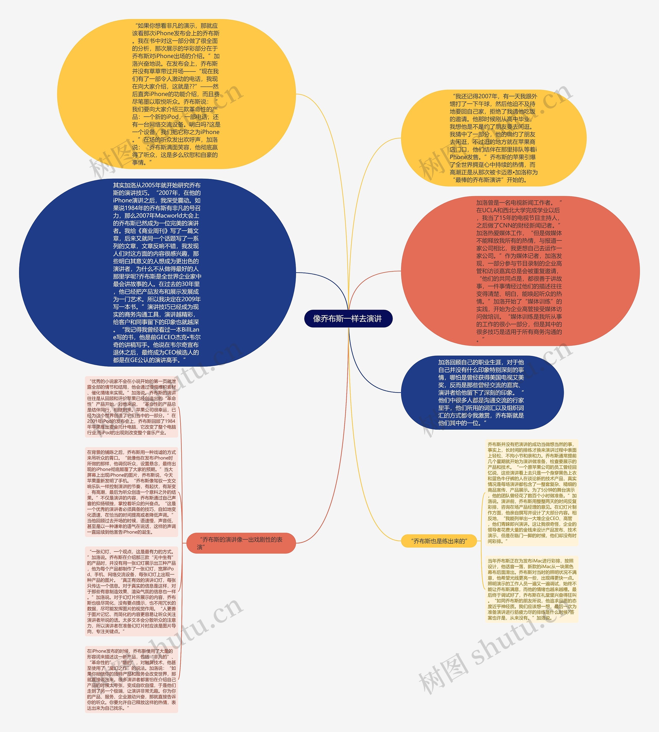 当年乔布斯正在为发布iMac进行彩排,按照设计,他话音一落,新款的iMac从一块黑色幕布后面滑出。乔布斯对当时的照明状况不满意,他希望光线更亮一些,出现得更快一点。照明演示的工作人员一遍又一遍调试,始终不能让乔布斯满意,而他的情绪也越来越糟。最后终于调试好了,乔布斯在礼堂里兴奋得狂叫。“如同乔布斯的朋友所说,他追求品质的态度近乎神经质。我们应该想一想,最后一次为准备演讲进行筋疲力尽的排练是什么时候?答案也许是,从来没有。”加洛说。