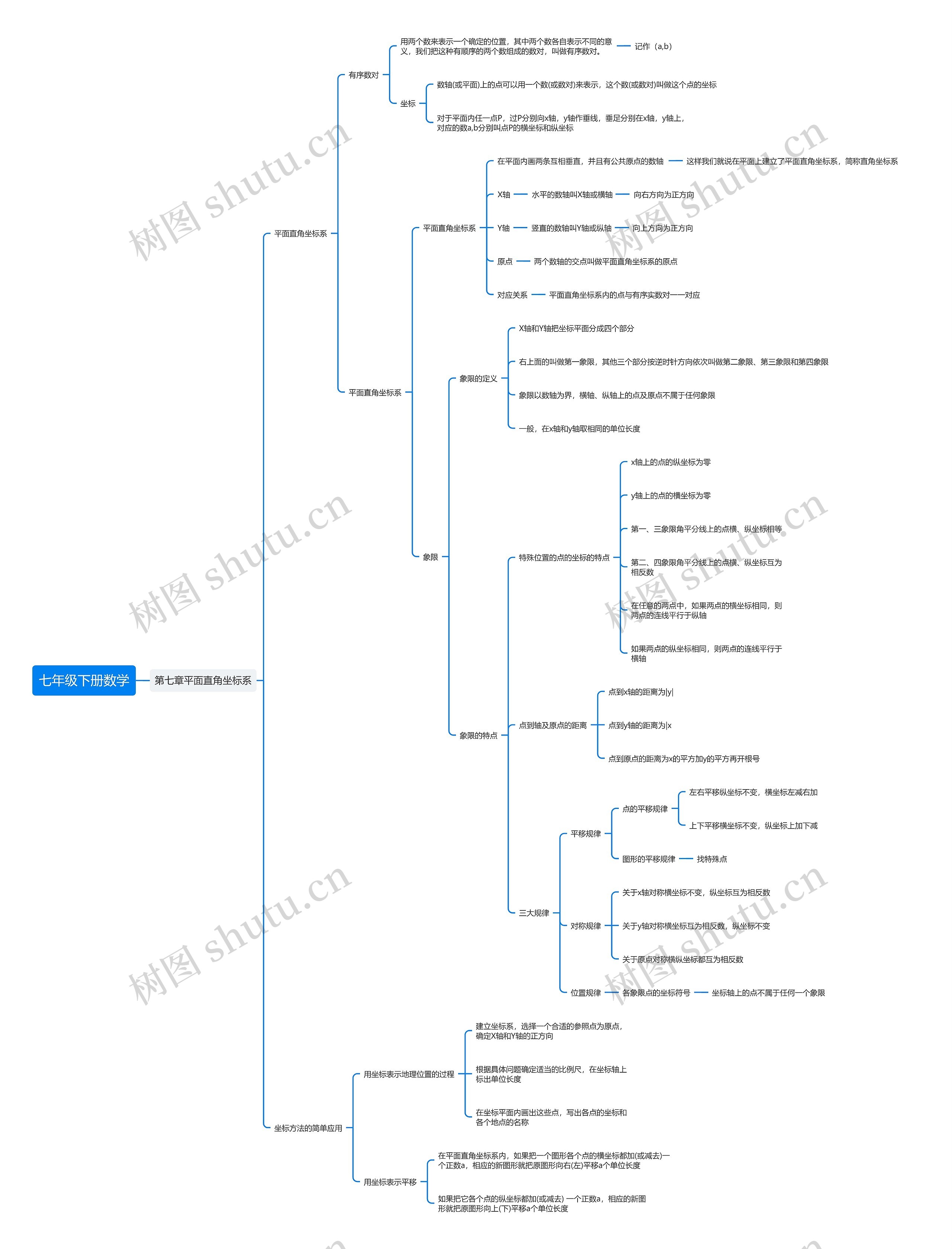 七年级下册数学第七章思维导图平面直角坐标系可以用有序数对来表示坐标,并可用两条互相垂直有公共原点的数轴建立,X轴是水平的,向右为正,Y轴是竖直的,向上为正,坐标轴的交点叫做坐标系的原点,象限是坐标平面的四个部分,以数轴为界,规律包含平移、对称和位置规律,定位地理位置的过程也可以用坐标表示,同时平移图形的方式也可以用坐标表示。