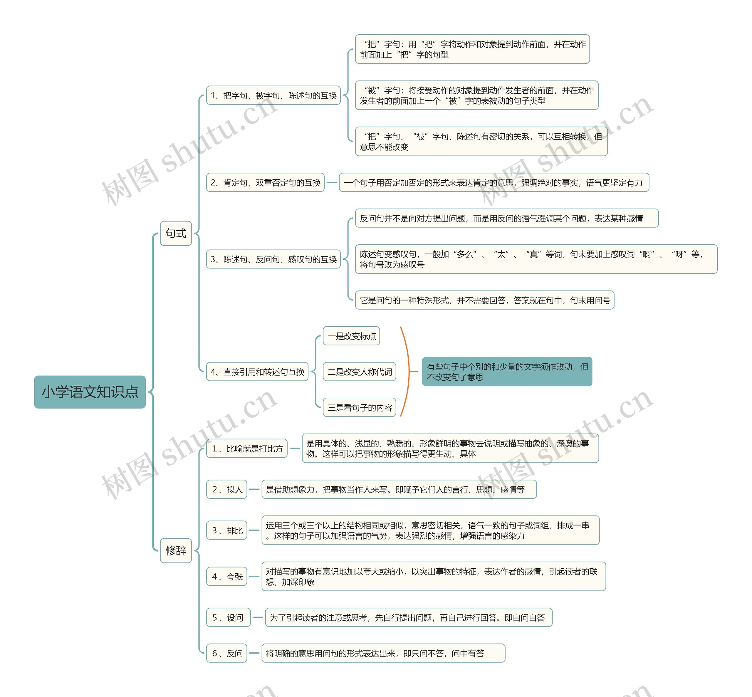 树图思维导图提供《小学语文句式与修辞手法思维导图》在线思维导图免费制作,点击“编辑”按钮,可对《小学语文句式与修辞手法思维导图》进行在线思维导图编辑,本思维导图属于思维导图模板主题,文件编号是:7fb73f467220f6ec3bd4b7603f55631b