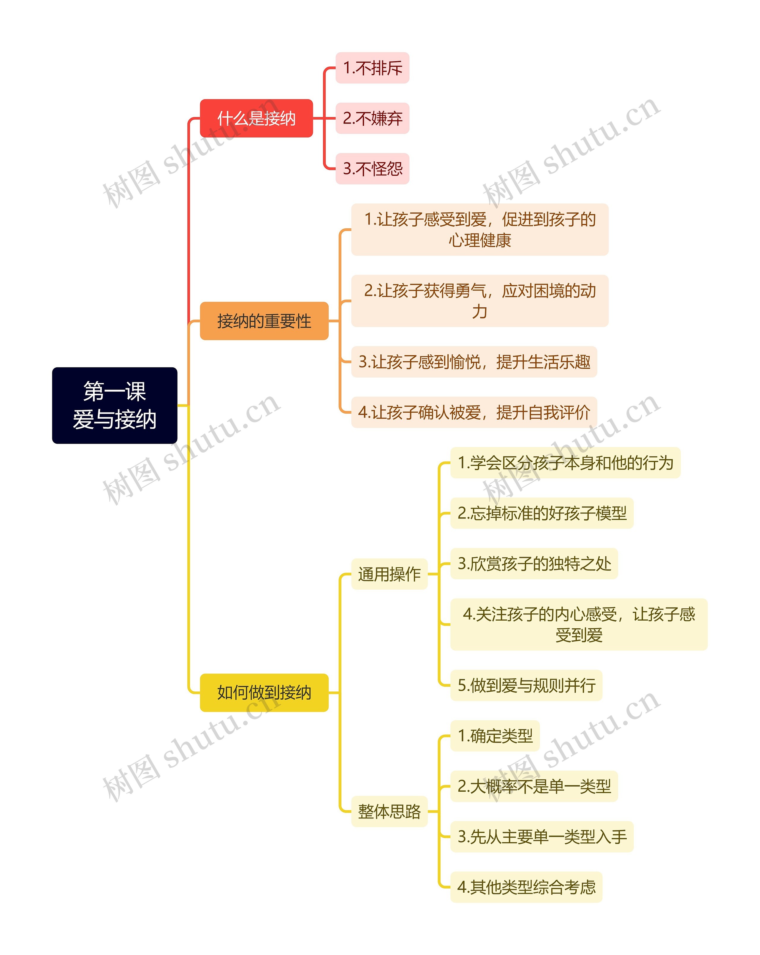 树图思维导图提供《第一课爱与接纳》在线思维导图免费制作,点击“编辑”按钮,可对《第一课爱与接纳》进行在线思维导图编辑,本思维导图属于思维导图模板主题,文件编号是:7f50b2a5acd9a2f577b3f94037ea2bec
