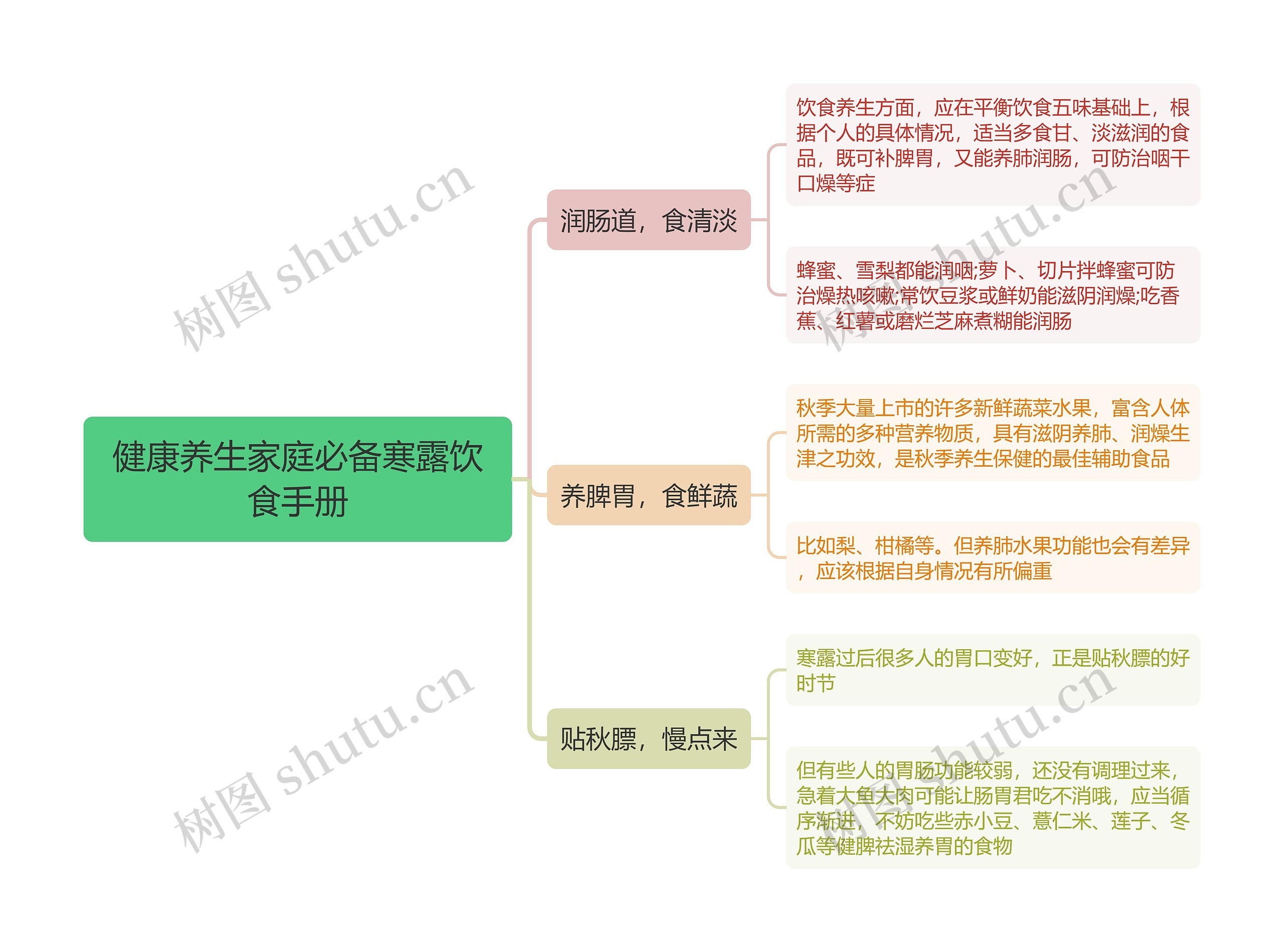 树图思维导图提供《健康养生家庭必备寒露饮食手册思维导图》在线思维导图免费制作,点击“编辑”按钮,可对《健康养生家庭必备寒露饮食手册思维导图》进行在线思维导图编辑,本思维导图属于思维导图模板主题,文件编号是:88093a2a32fe7e5e30c3f7e2b8473043