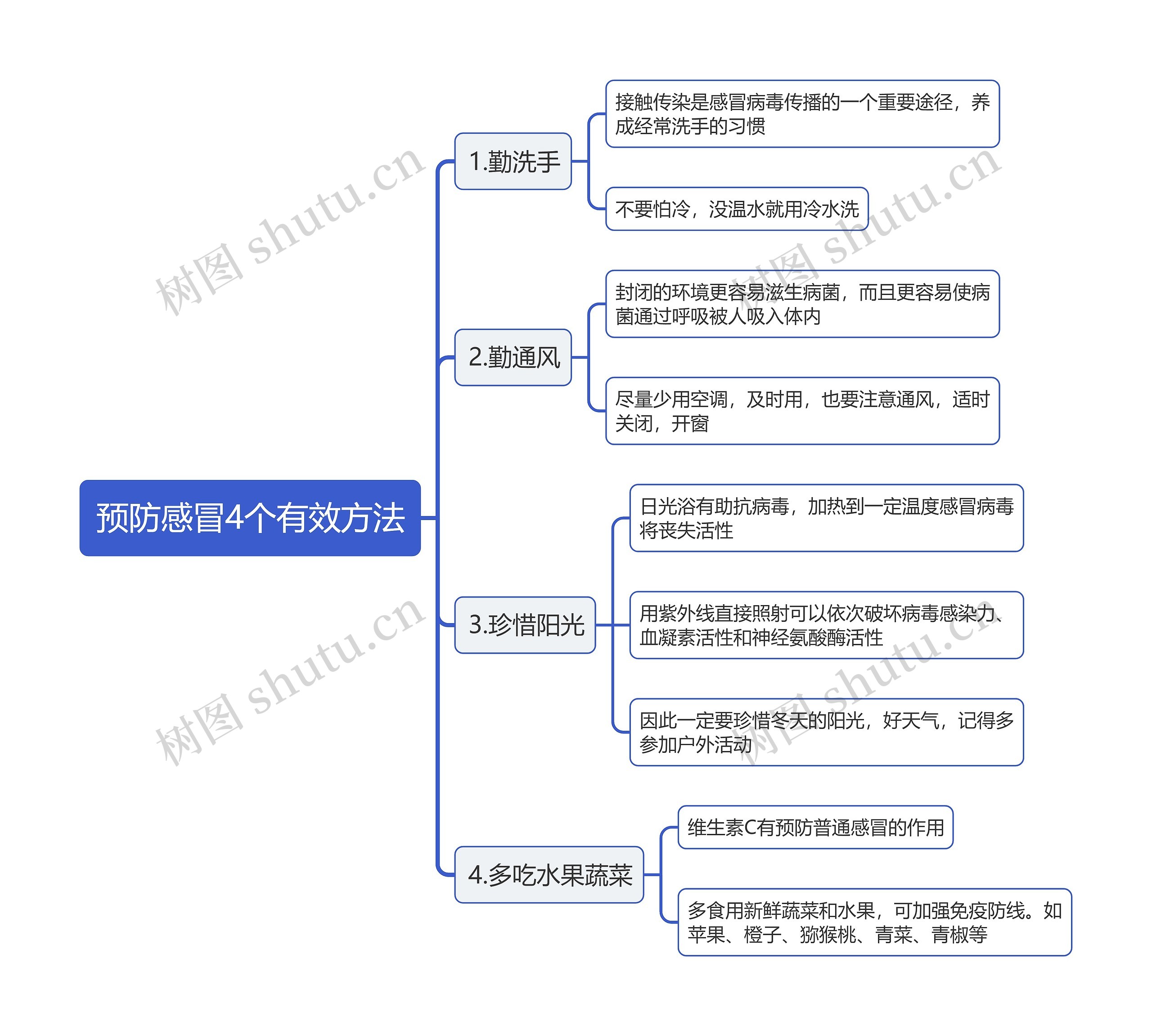 树图思维导图提供《预防感冒4个有效方法思维导图》在线思维导图免费制作,点击“编辑”按钮,可对《预防感冒4个有效方法思维导图》进行在线思维导图编辑,本思维导图属于思维导图模板主题,文件编号是:54157eac6bea98d528a56e48aa277eda