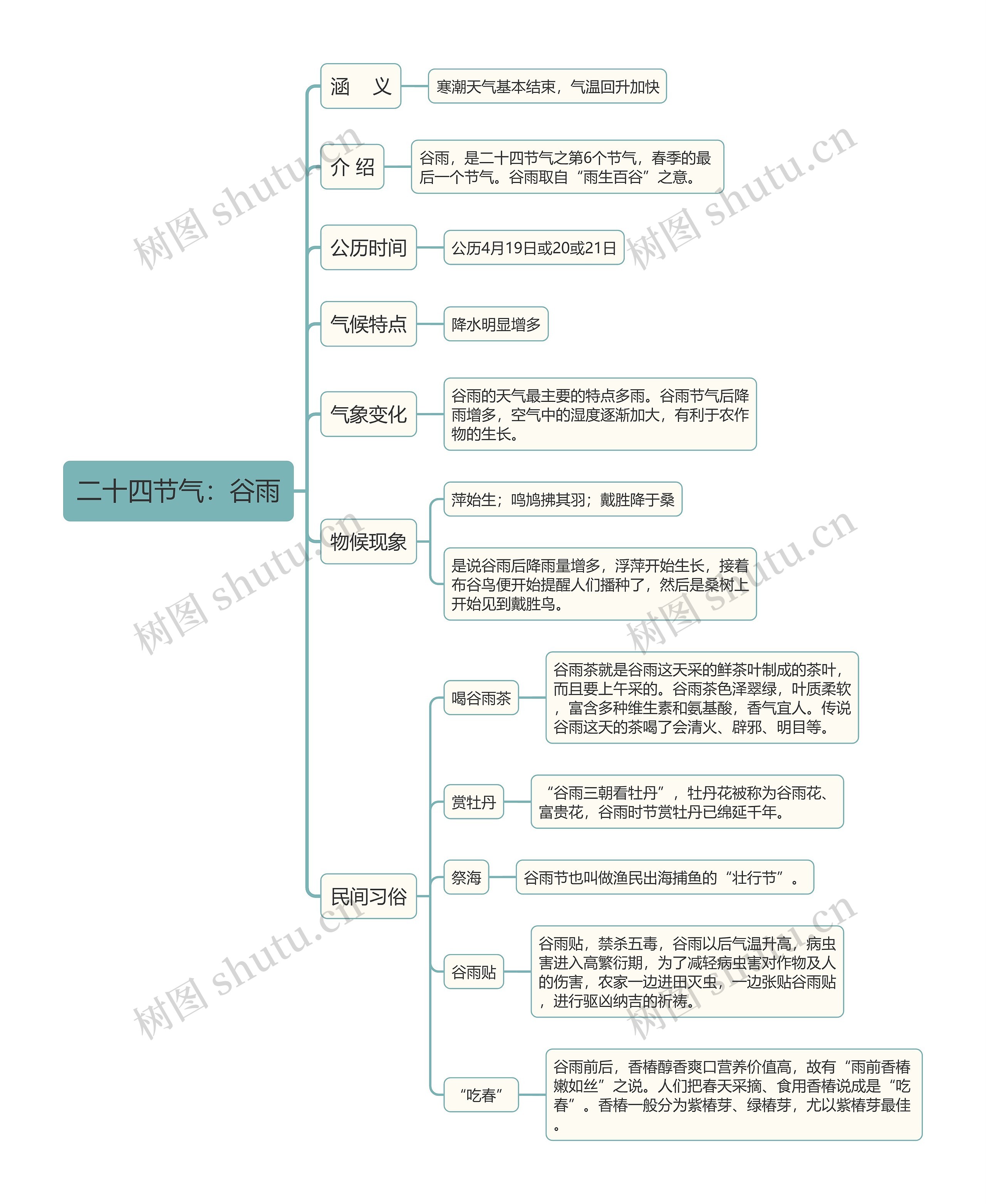 树图思维导图提供《二十四节气谷雨思维导图》在线思维导图免费制作,点击“编辑”按钮,可对《二十四节气谷雨思维导图》进行在线思维导图编辑,本思维导图属于思维导图模板主题,文件编号是:bc7d304820dd77d7f9dd1abb27a7bcb7