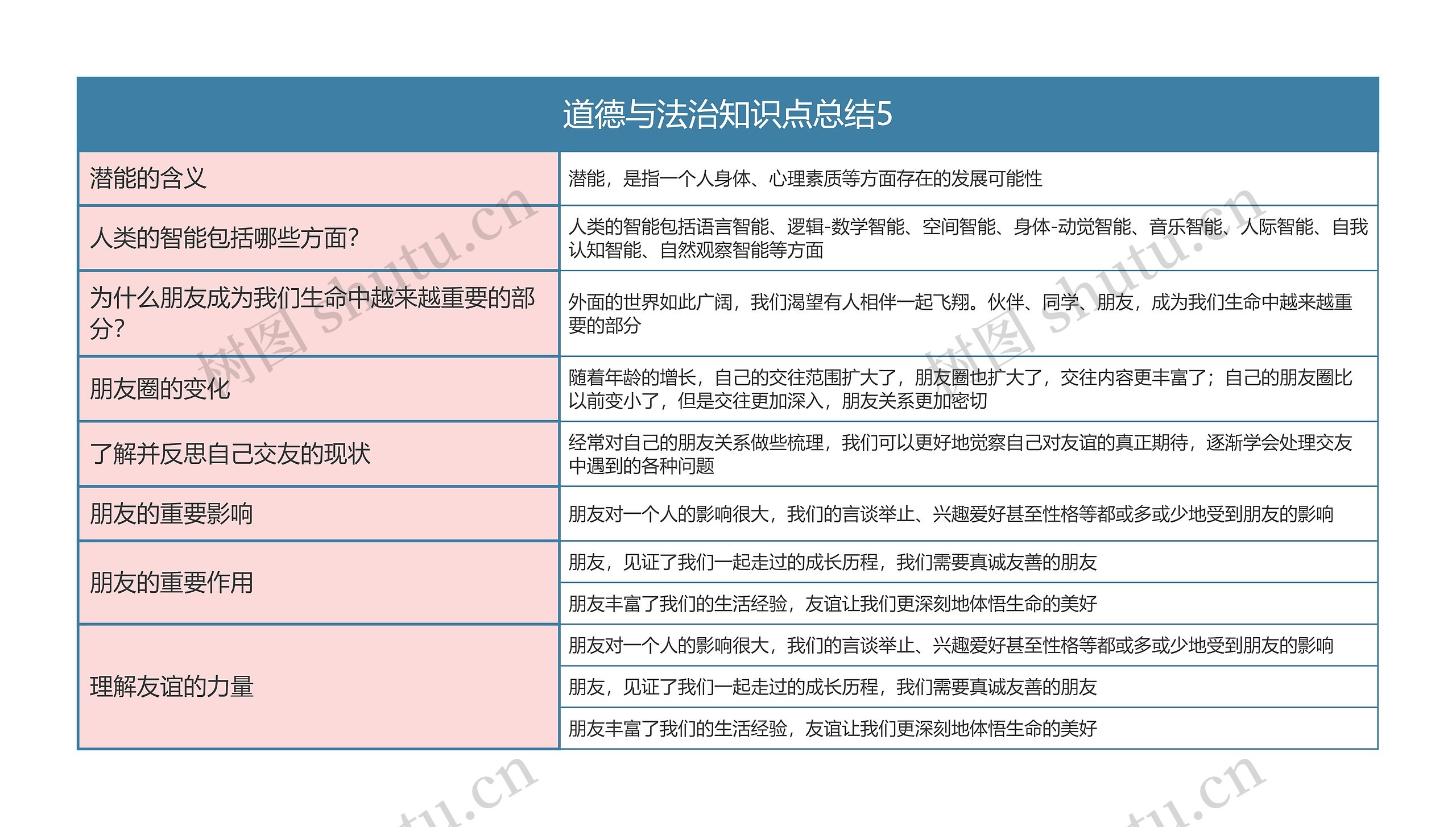七年级上册 道德与法治知识点总结5内容包括潜能的含义,人类的智能包括哪些方面?,为什么朋友成为我们生命中越来越重要的部分?,朋友圈的变化