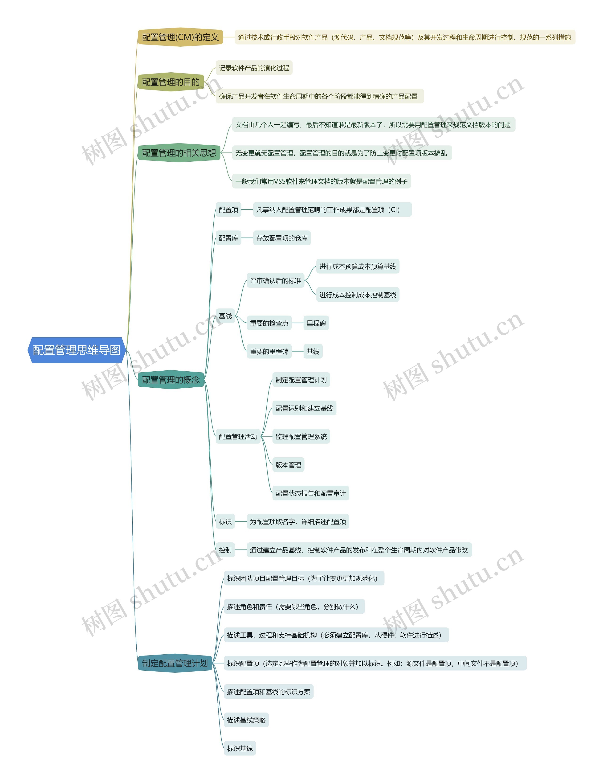 树图思维导图提供《配置管理思维导图》在线思维导图免费制作,点击“编辑”按钮,可对《配置管理思维导图》进行在线思维导图编辑,本思维导图属于思维导图模板主题,文件编号是:ac441a3fc4b92d7a6eecfda0e707a3ff