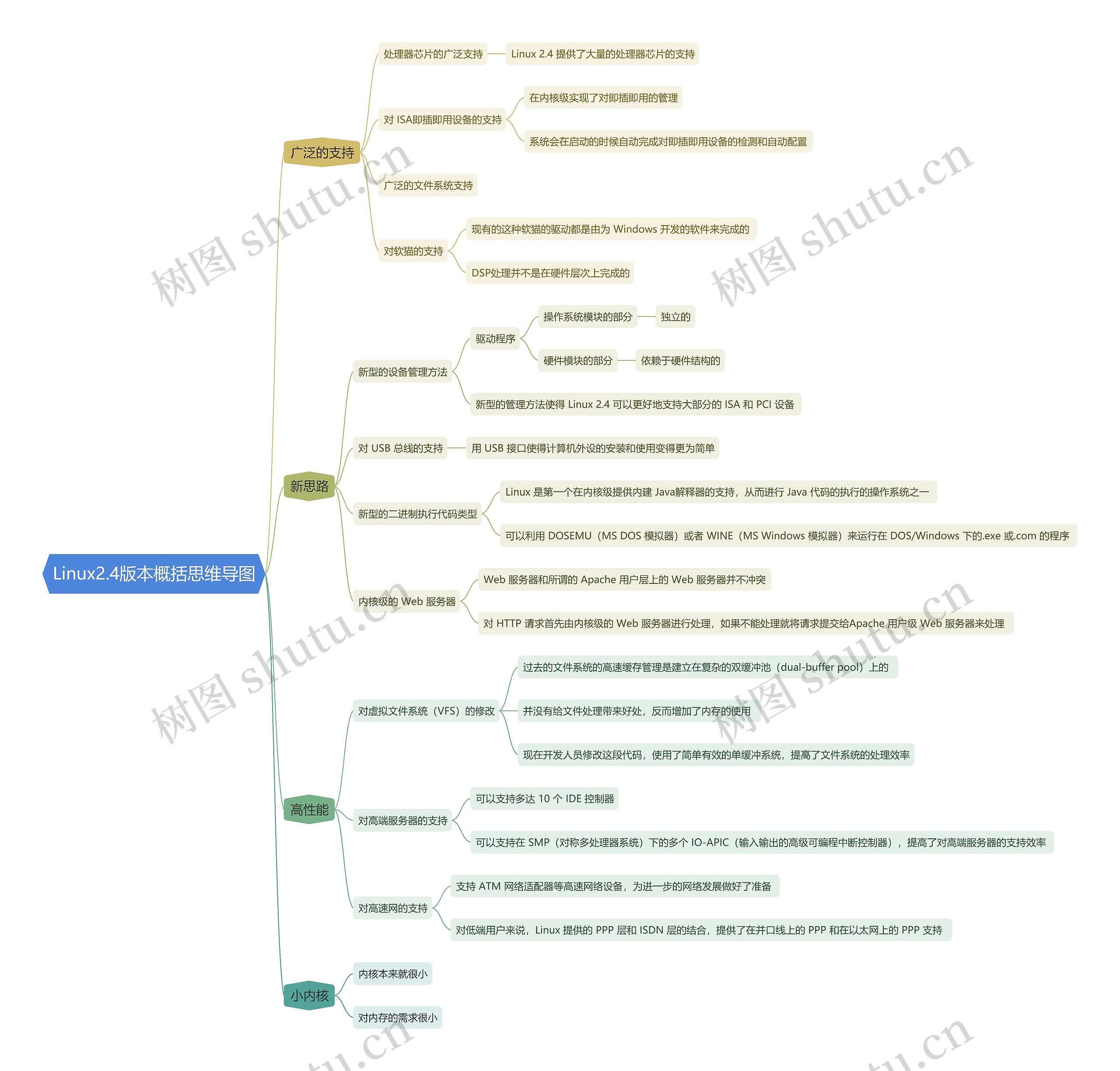Linux中有关Linux2.4版本概括的思维导图,包括广泛的支持、新思路、小内核、高性能