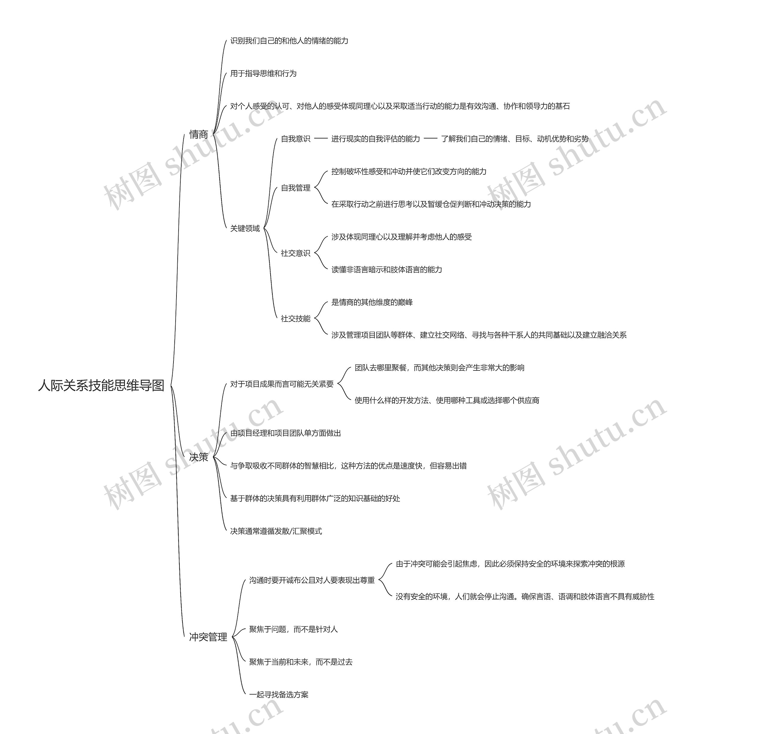 PMP项目管理中有关人际关系技能的思维导图,包括情商、决策、冲突管理