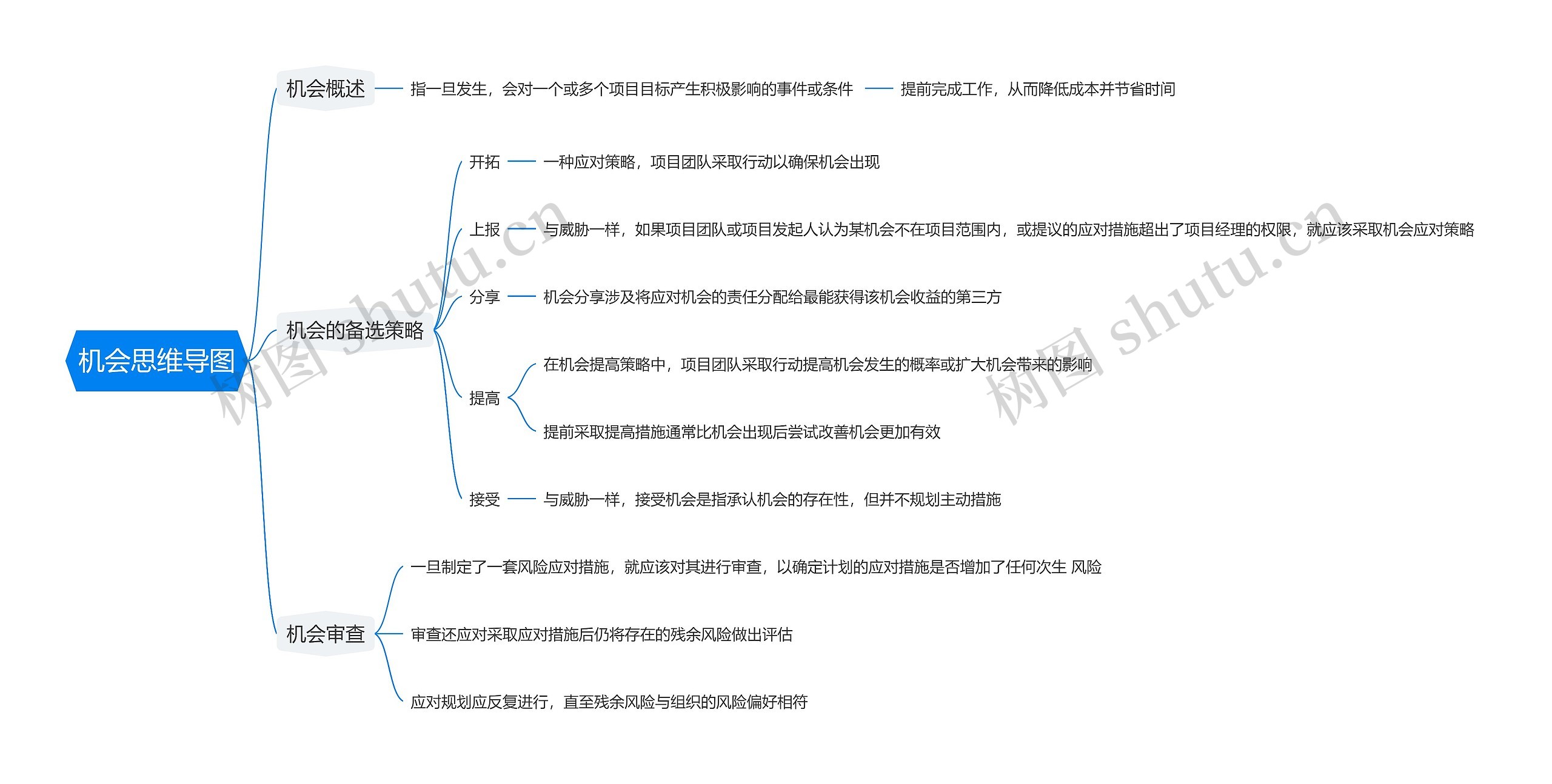 PMP项目管理中有关机会的思维导图,包括机会概述、机会的备选策略、机会审查
