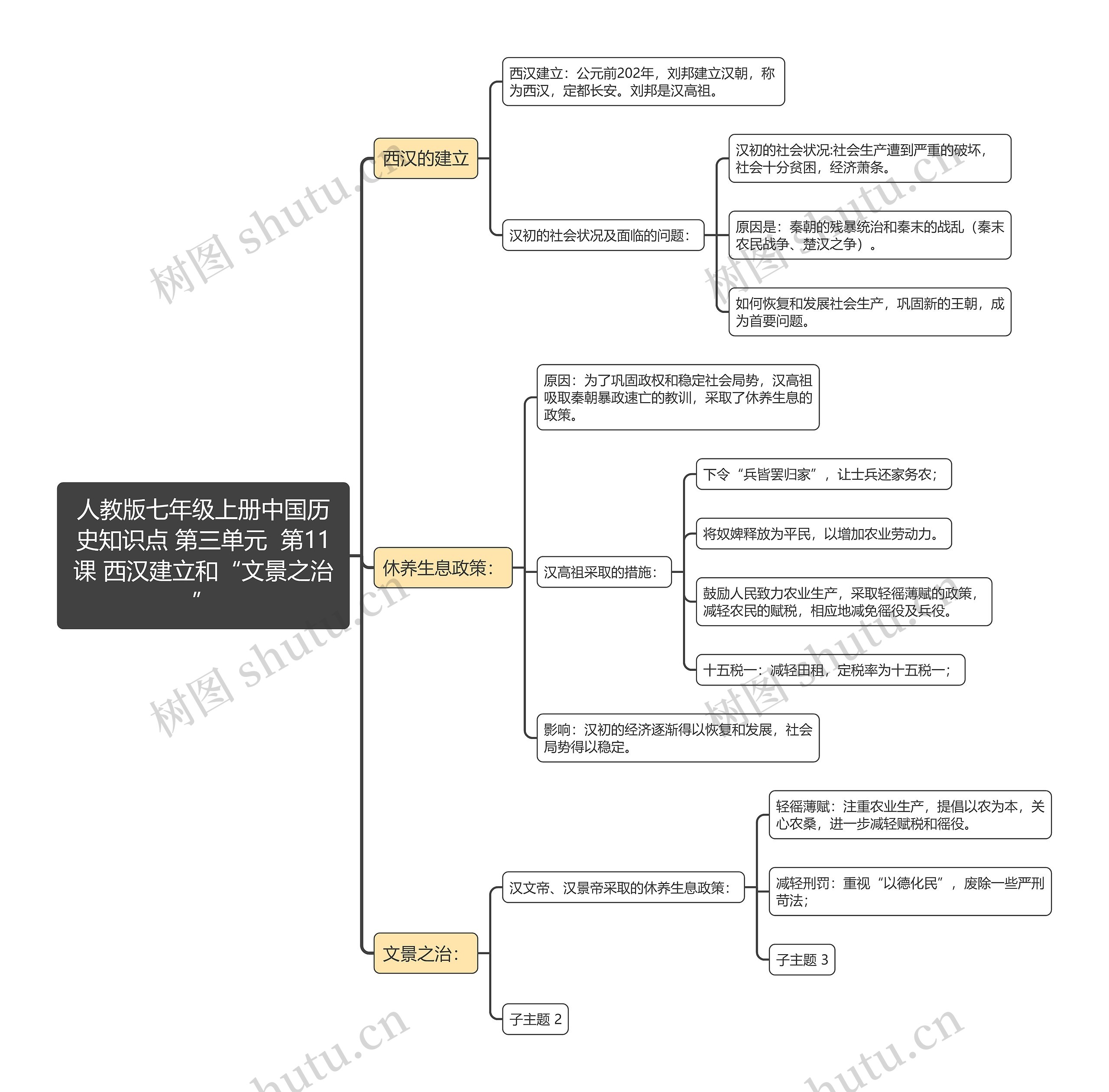 树图思维导图提供《人教版七年级上册中国历史知识点 第三单元 第11课 西汉建立和“文景之治”》在线思维导图免费制作,点击“编辑”按钮,可对《人教版七年级上册中国历史知识点 第三单元 第11课 西汉建立和“文景之治”》进行在线思维导图编辑,本思维导图属于思维导图模板主题,文件编号是:6da0f0b849defee8e48f6f48e41024ff