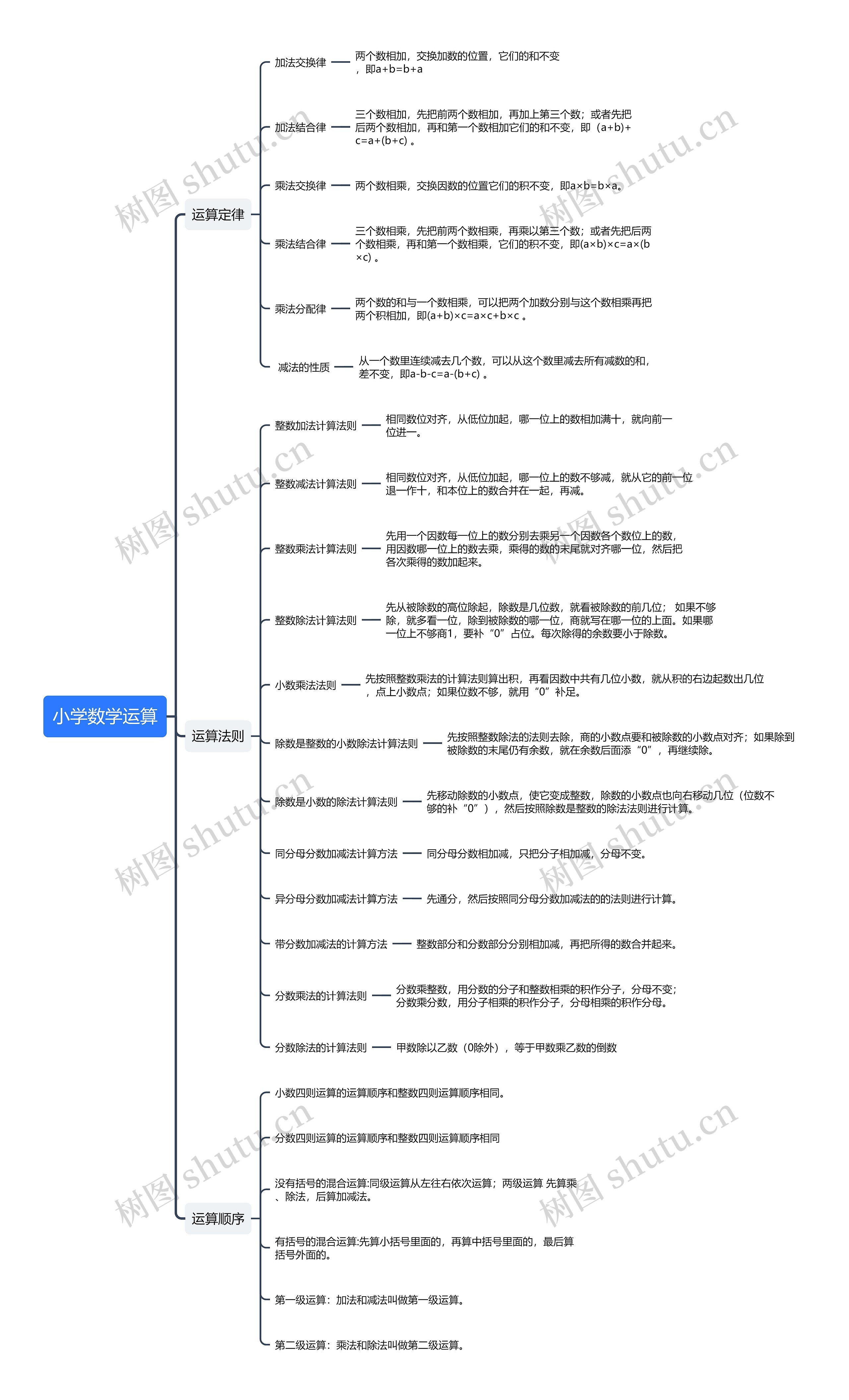 小学数学运算思维导图包含运算定律、运算法则和分数的加减乘除四方面内容,加法交换律、加法结合律、乘法交换律、乘法结合律和乘法分配律都是运算定律的知识点,整数加减乘除的计算法则也是必须掌握的内容,小数乘法法则和除数为整数或小数的除法计算法则同样需要熟知。在分数的加减乘除中,同分母分数和异分母分数加减的计算方法、带分数加减法的计算方法和分数乘法的计算法则都是非常重要的。