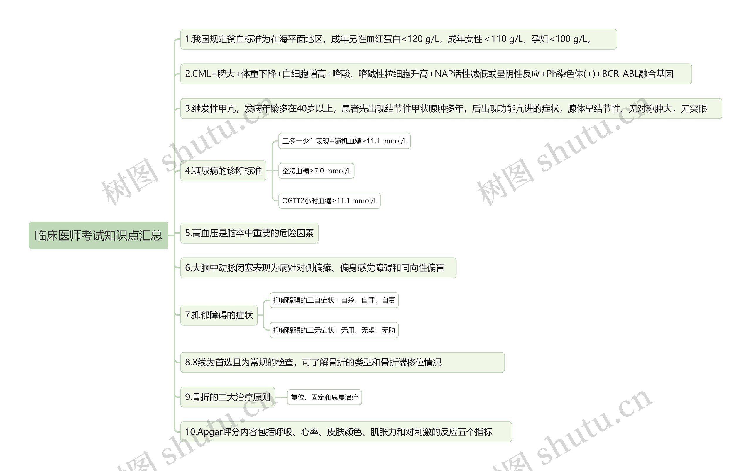 2.CML=脾大+体重下降+白细胞增高+嗜酸、嗜碱性粒细胞升高+NAP活性减低或呈阴性反应+Ph染色体(+)+BCR-ABL融合基因