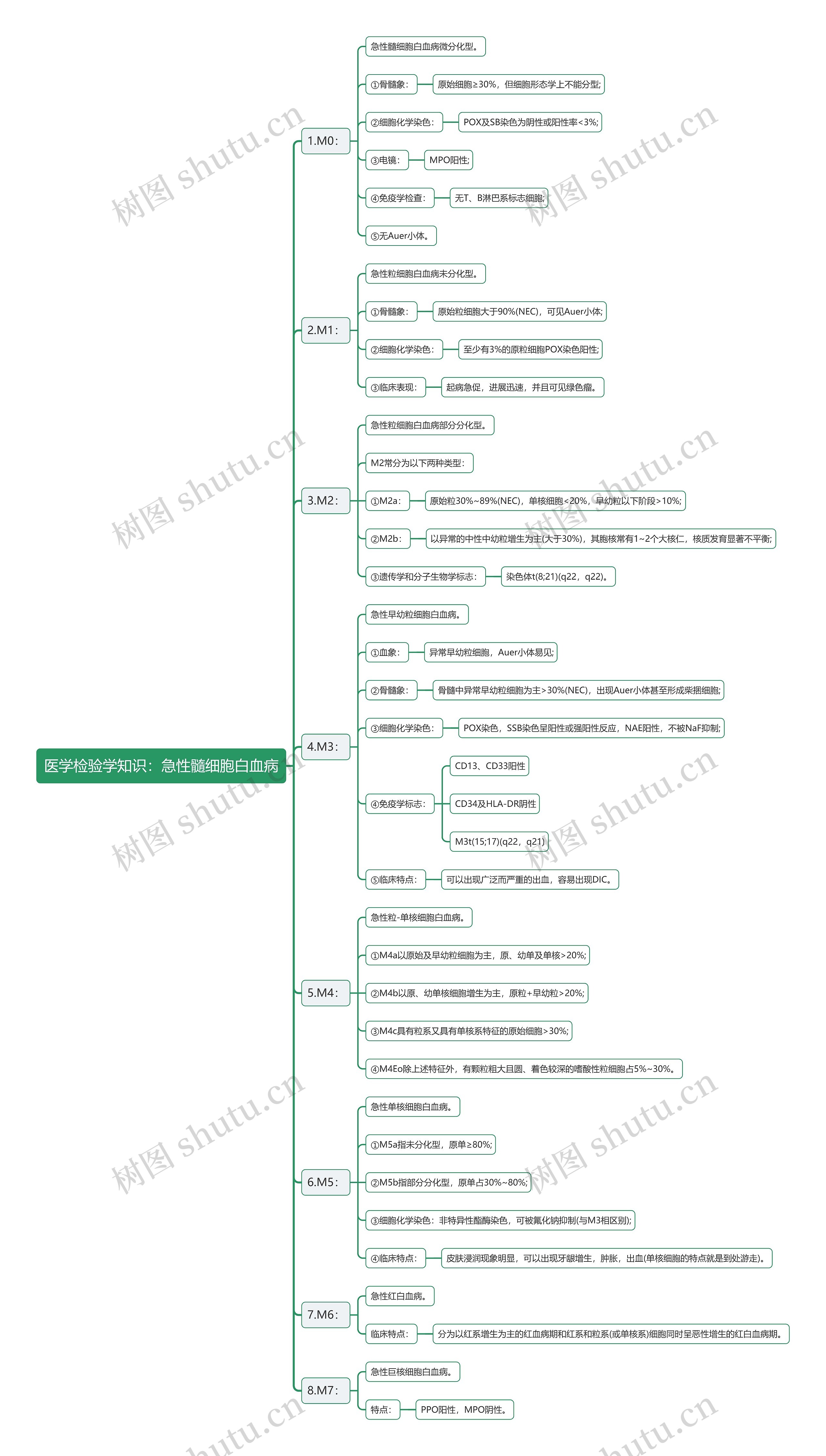 本思维导图主要总结医疗卫生医学检验学知识:急性髓细胞白血病