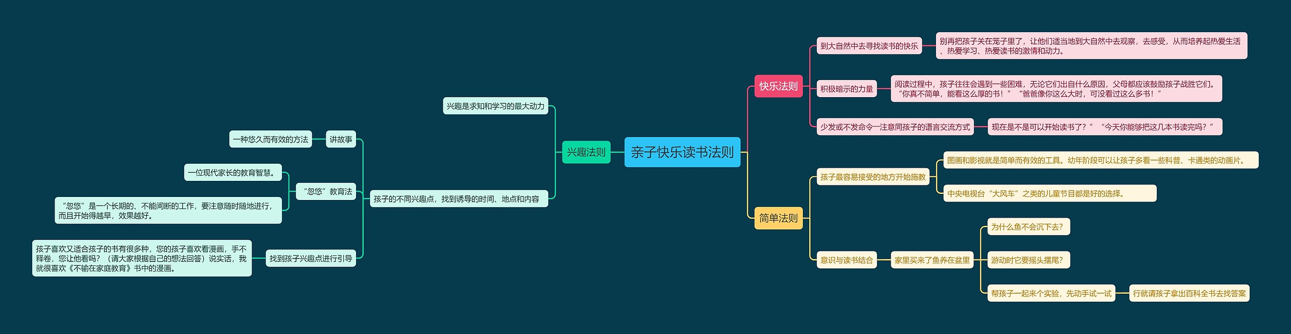 树图思维导图提供《亲子快乐读书法则》在线思维导图免费制作,点击“编辑”按钮,可对《亲子快乐读书法则》进行在线思维导图编辑,本思维导图属于思维导图模板主题,文件编号是:38f9589d6c1d22ec6b894c4eb3323894