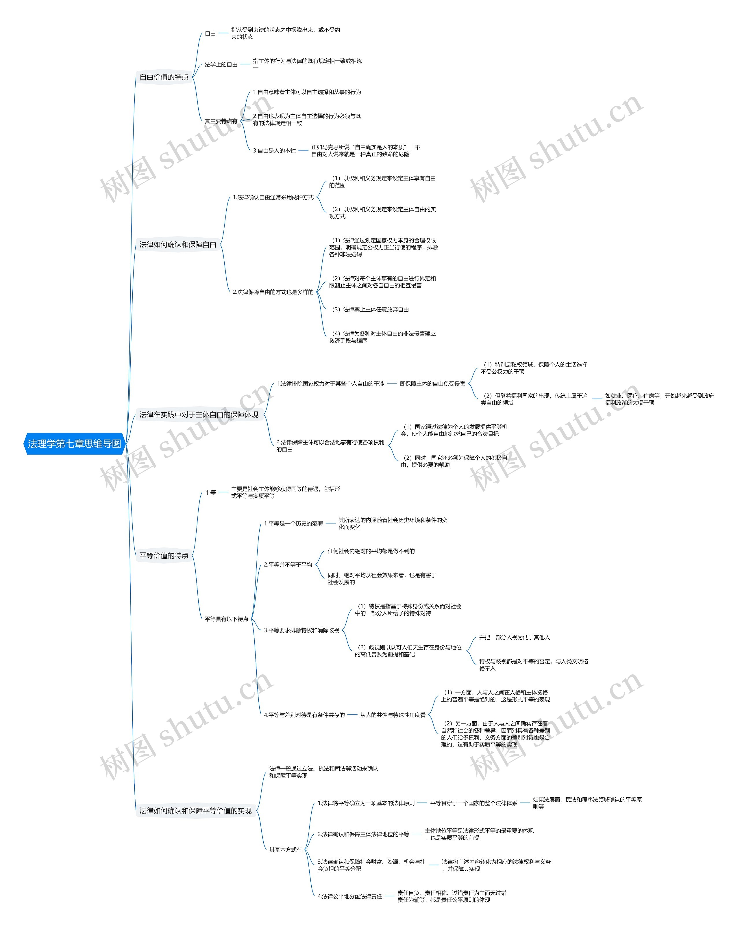 法理学中有关第七章的思维导图,包括自由价值的特点、法律如何确认和保障自由、法律在实践中对于主体自由的保障体现、平等价值的特点、法律如何确认和保障平等价值的实现
