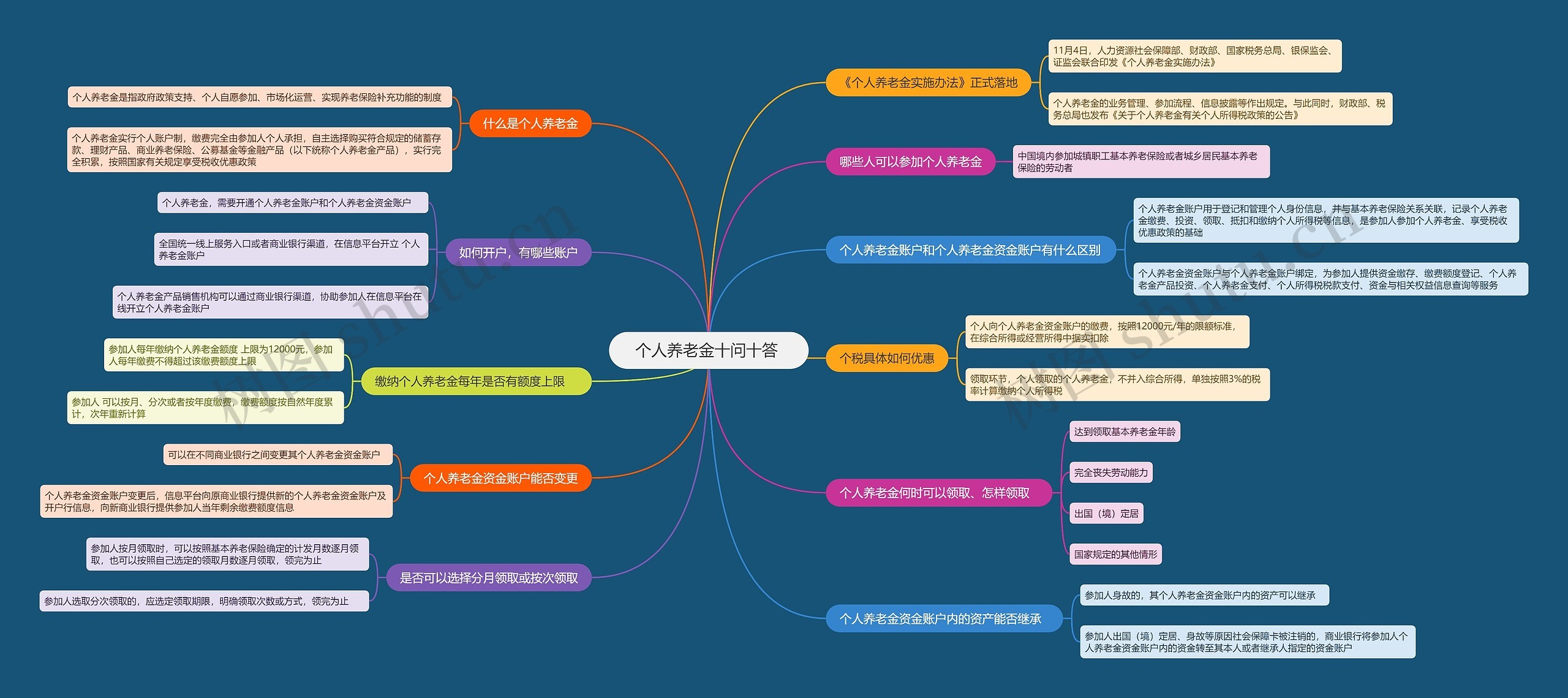 树图思维导图提供《个人养老金十问十答 》在线思维导图免费制作,点击“编辑”按钮,可对《个人养老金十问十答 》进行在线思维导图编辑,本思维导图属于思维导图模板主题,文件编号是:fc7971bb179543b66d05988423d24d44