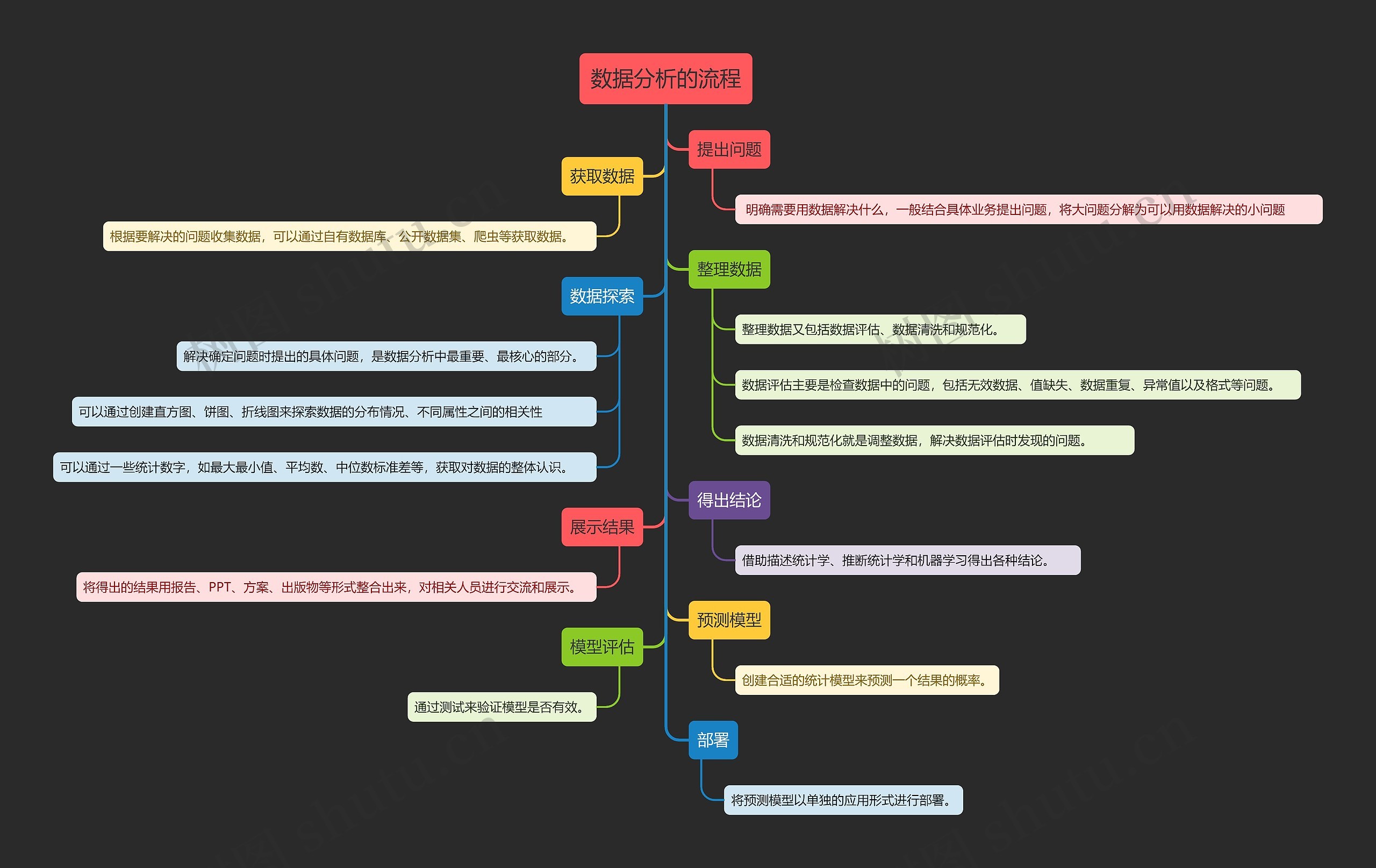 树图思维导图提供《数据分析的流程》在线思维导图免费制作,点击“编辑”按钮,可对《数据分析的流程》进行在线思维导图编辑,本思维导图属于思维导图模板主题,文件编号是:b21b8e2b9378d7a27c9606e19e1e4583