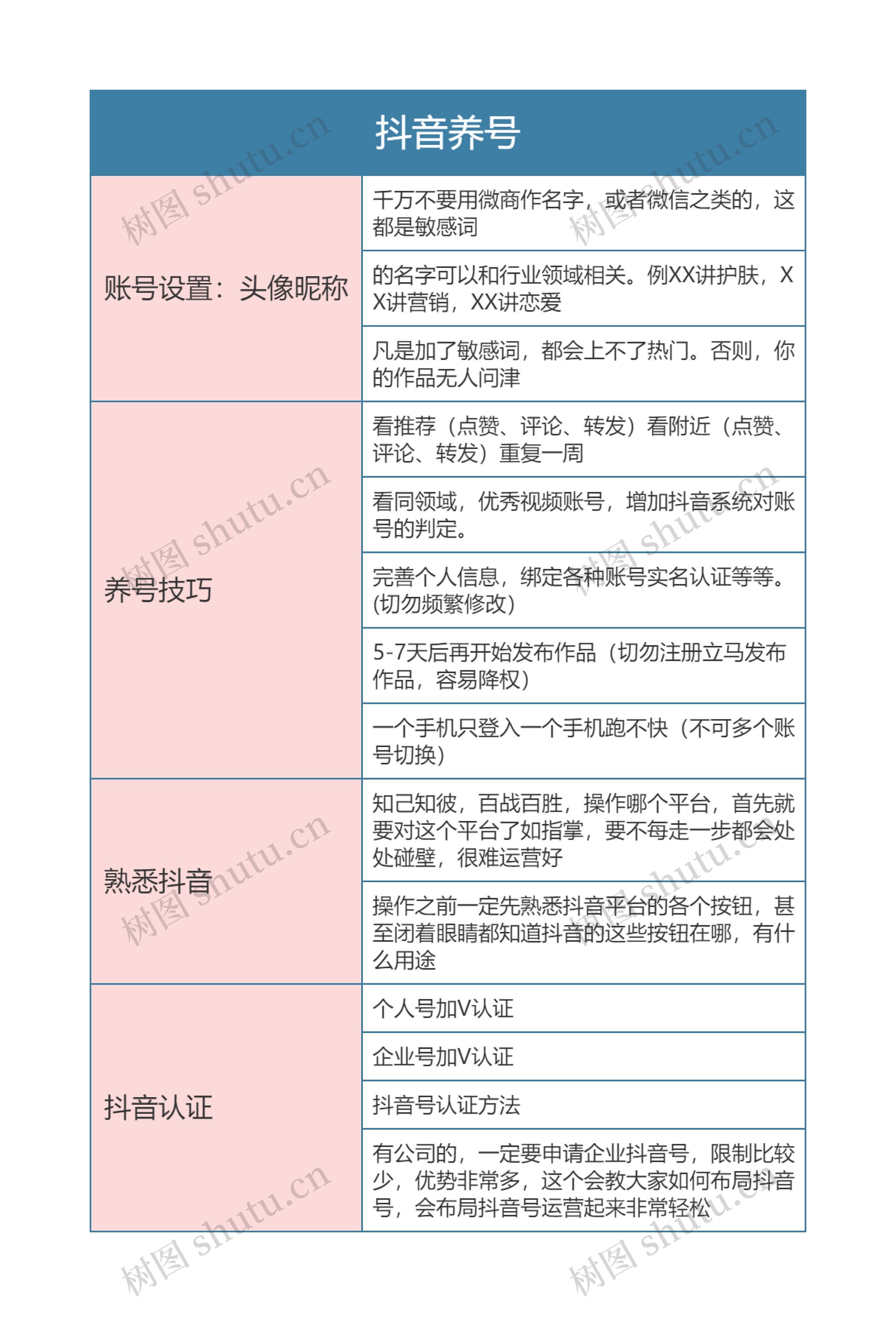 树图思维导图提供《抖音运营 抖音养号思维导图》在线思维导图免费制作,点击“编辑”按钮,可对《抖音运营 抖音养号思维导图》进行在线思维导图编辑,本思维导图属于思维导图模板主题,文件编号是:7fd5d73e636f1641f48d0e144f8b03f6