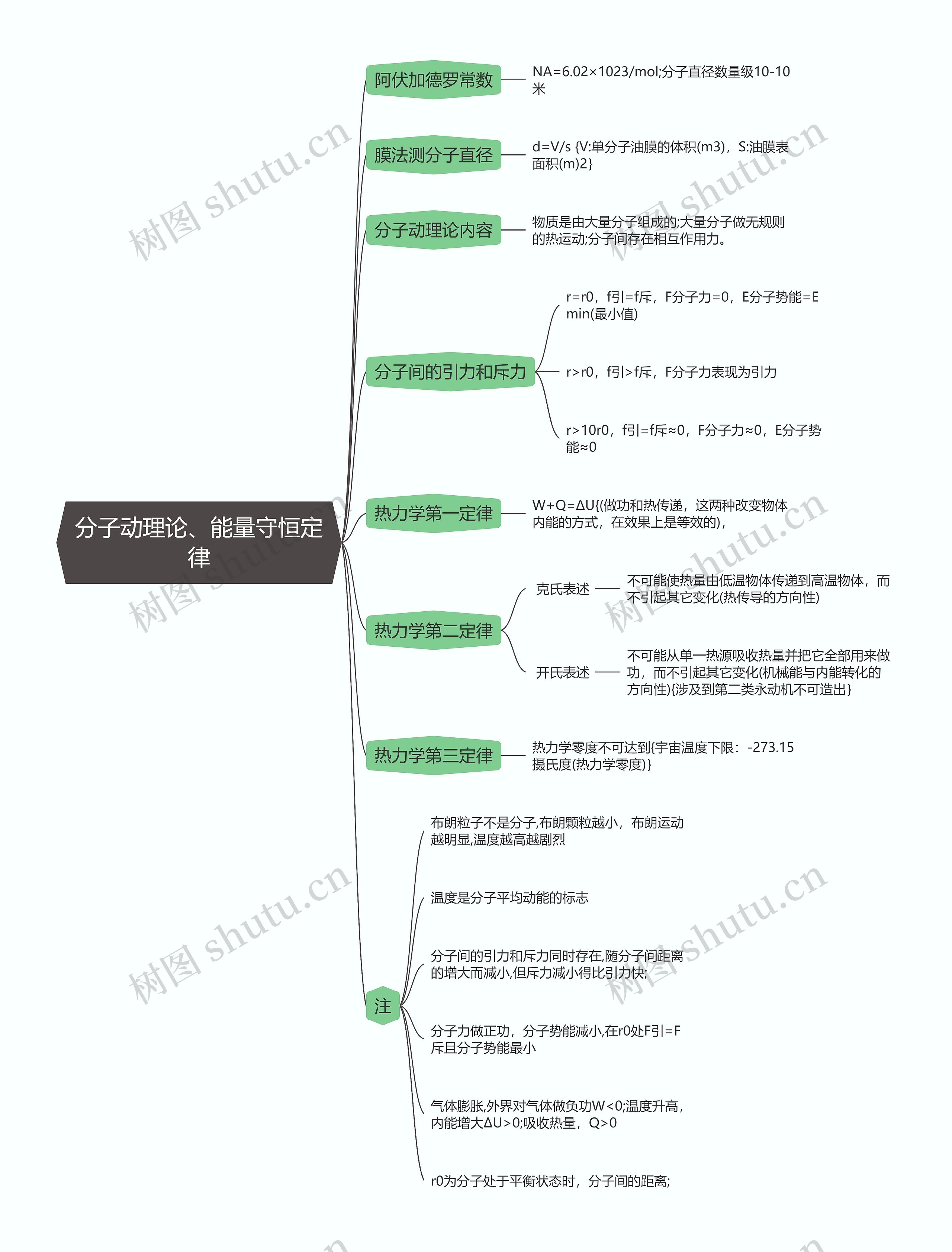 物理必修一 分子动理论、能量守恒定律内容包括阿伏加德罗常数,油膜法测分子直径,分子动理论内容,热力学第一定律、第二,第三定律等内容归纳