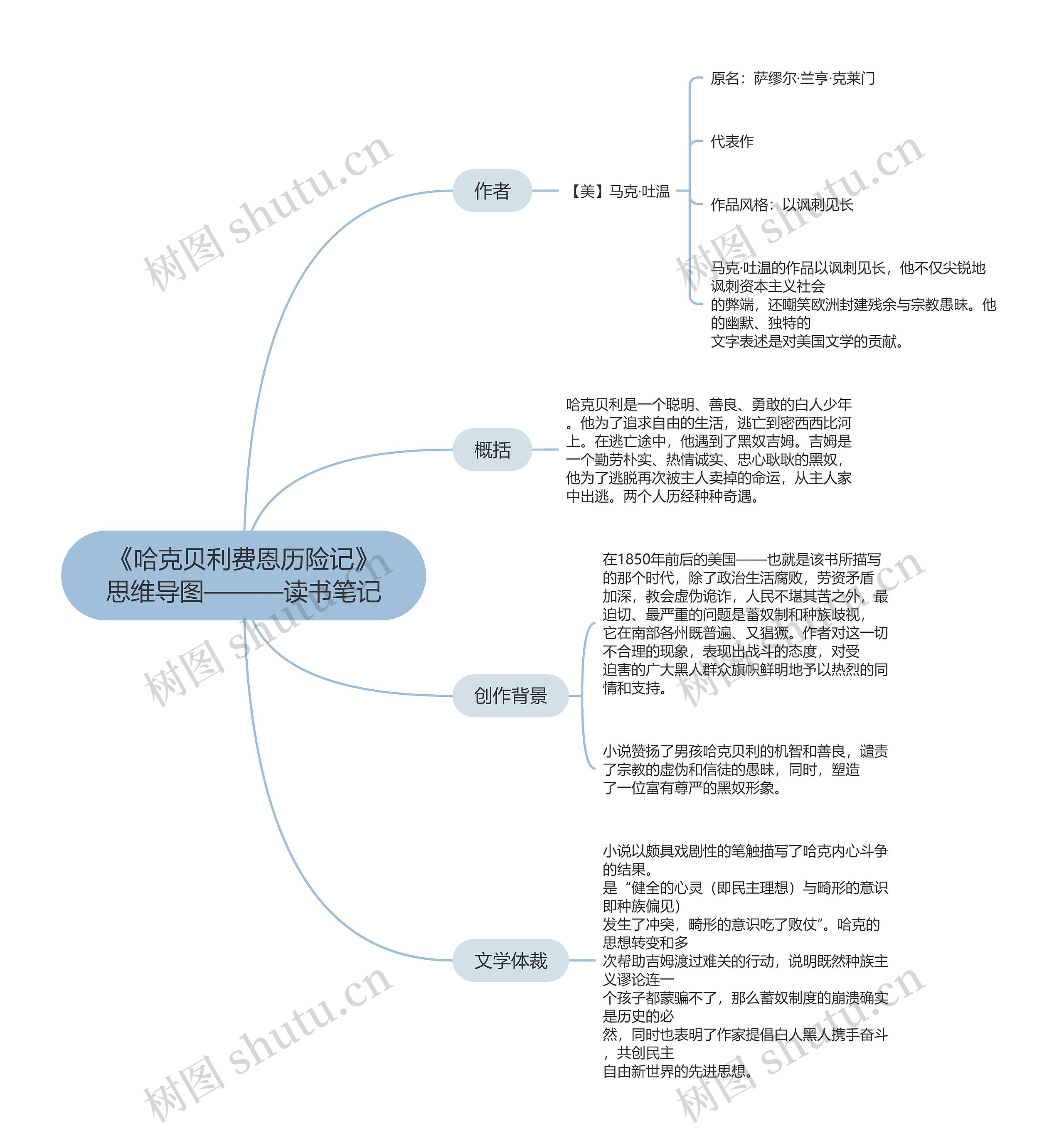 树图思维导图提供《哈克贝利费恩历险记-读书笔记》在线思维导图免费制作,点击“编辑”按钮,可对《哈克贝利费恩历险记-读书笔记》进行在线思维导图编辑,本思维导图属于思维导图模板主题,文件编号是:82a87d1bd0c72a806e22d22fa2a6364b