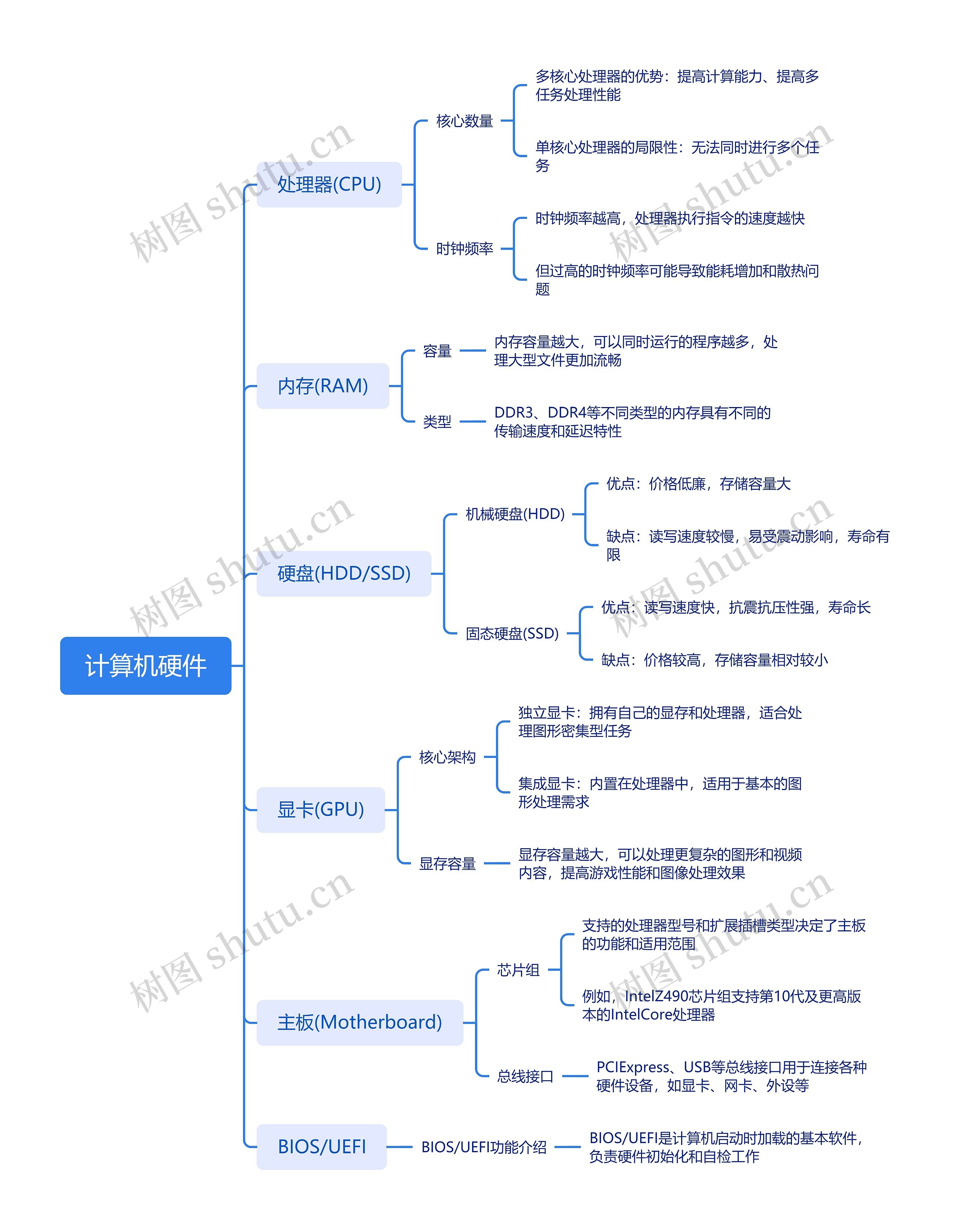 树图思维导图提供《计算机硬件思维脑图》在线思维导图免费制作,点击“编辑”按钮,可对《计算机硬件思维脑图》进行在线思维导图编辑,本思维导图属于思维导图模板主题,文件编号是:a8b55bf46c7e9e3851c5cb9d2154d2bf