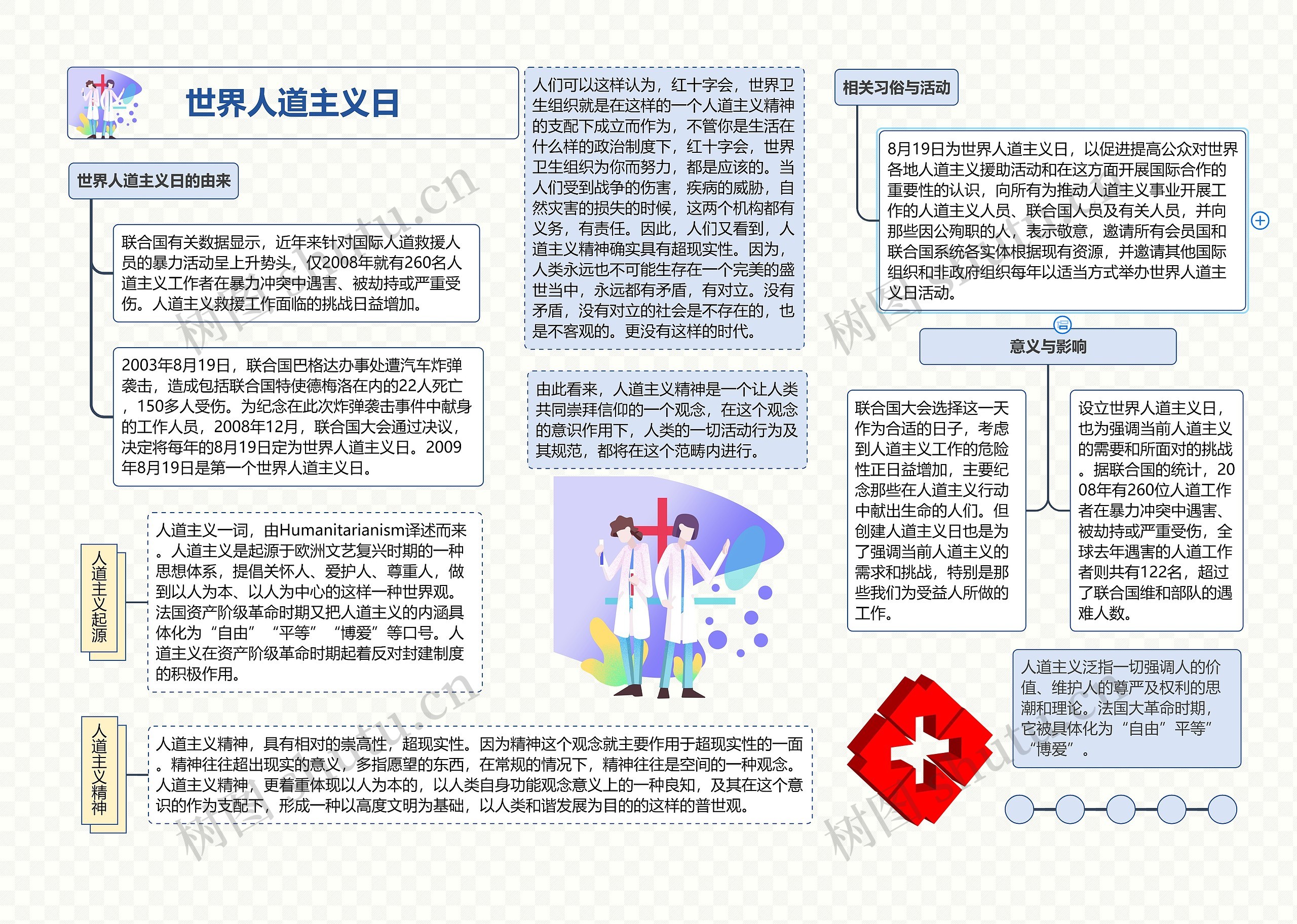 人们可以这样认为,红十字会,世界卫生组织就是在这样的一个人道主义精神的支配下成立而作为,不管你是生活在什么样的政治制度下,红十字会,世界卫生组织为你而努力,都是应该的。当人们受到战争的伤害,疾病的威胁,自然灾害的损失的时候,这两个机构都有义务,有责任。因此,人们又看到,人道主义精神确实具有超现实性。因为,人类永远也不可能生存在一个完美的盛世当中,永远都有矛盾,有对立。没有矛盾,没有对立的社会是不存在的,也是不客观的。更没有这样的时代。思维导图模板大纲