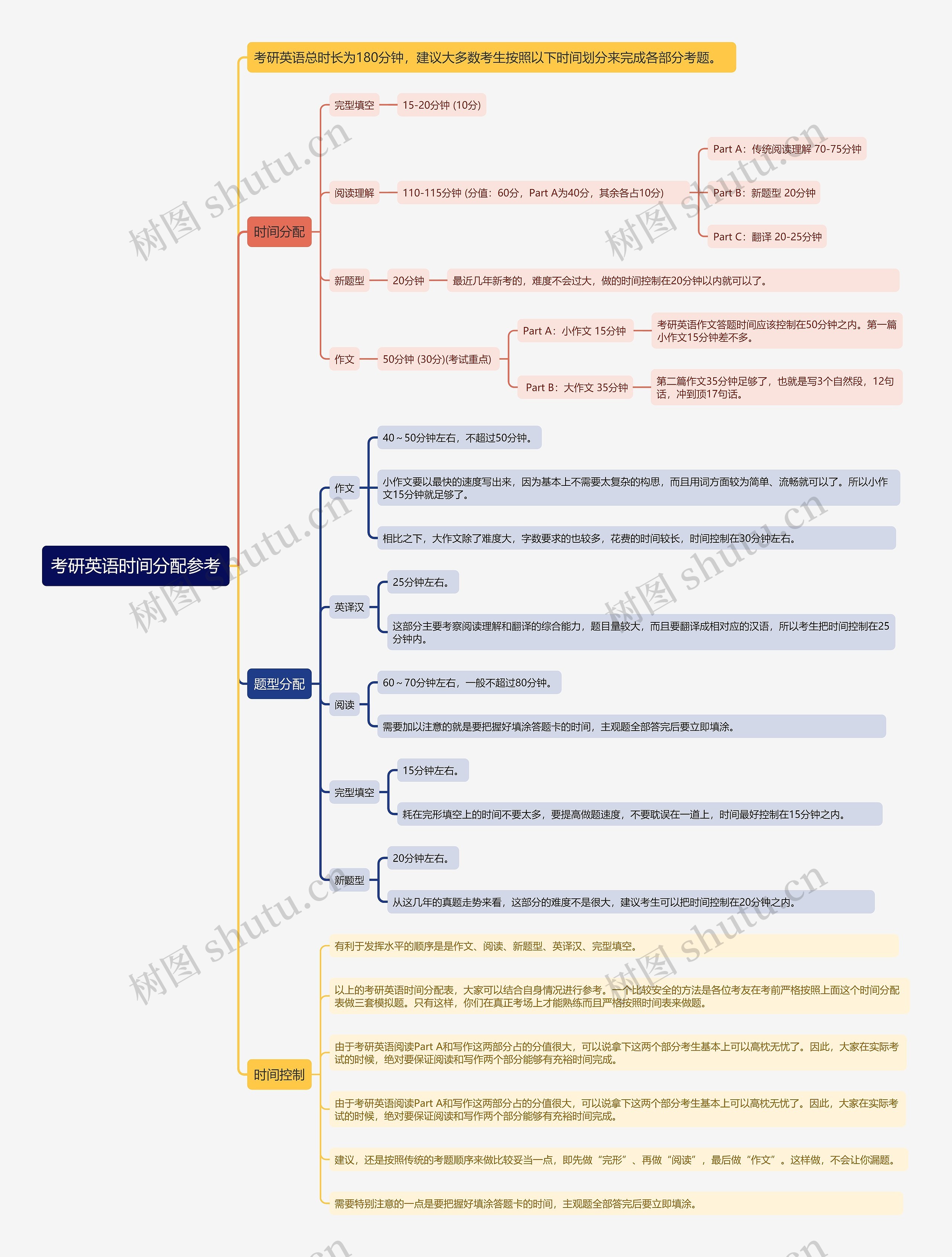 以上的考研英语时间分配表,大家可以结合自身情况进行参考。一个比较安全的方法是各位考友在考前严格按照上面这个时间分配表做三套模拟题。只有这样,你们在真正考场上才能熟练而且严格按照时间表来做题。