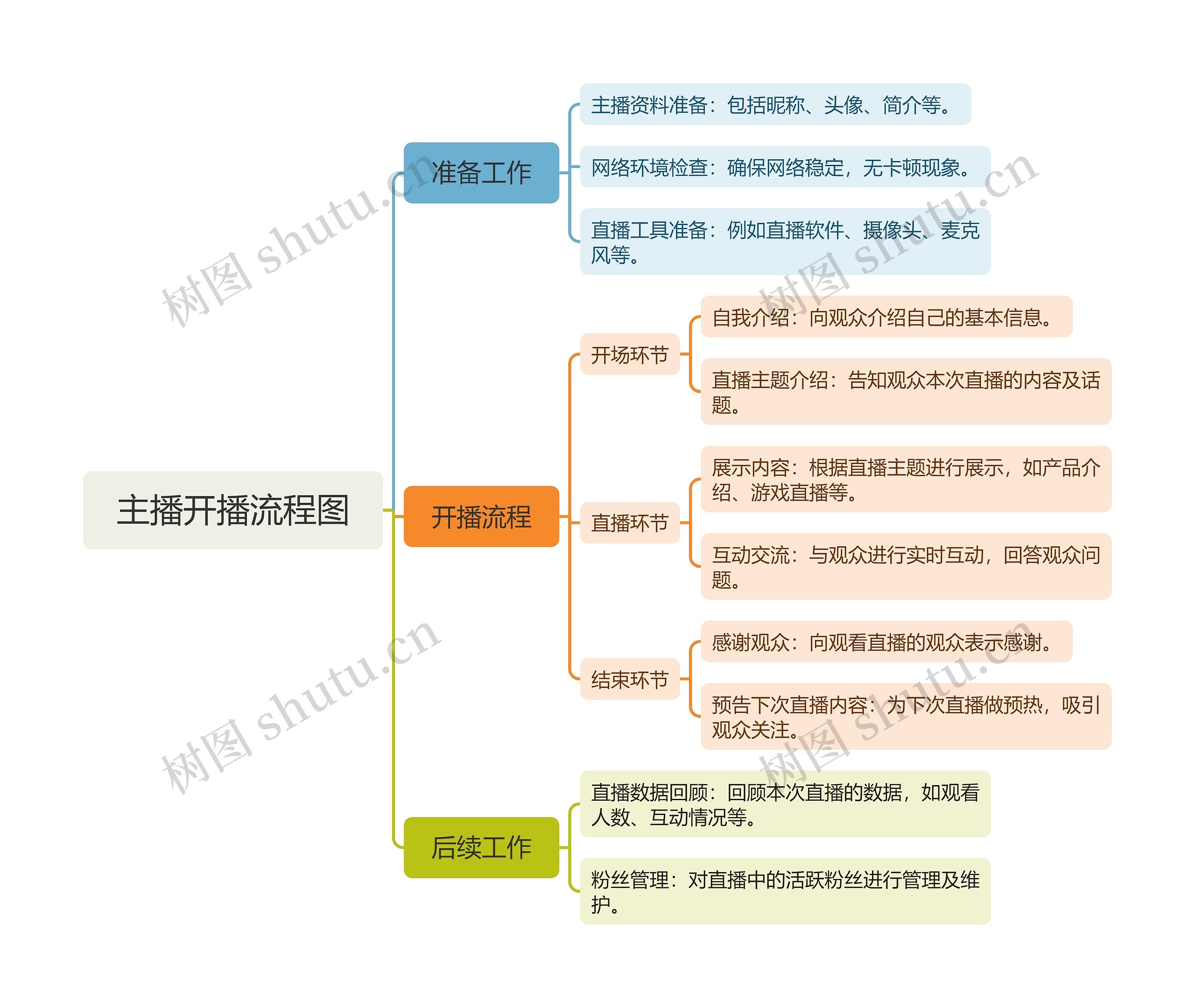 树图思维导图提供《主播开播流程图》在线思维导图免费制作,点击“编辑”按钮,可对《主播开播流程图》进行在线思维导图编辑,本思维导图属于思维导图模板主题,文件编号是:d5969a93cbbc8bde130e40d730f2a50e