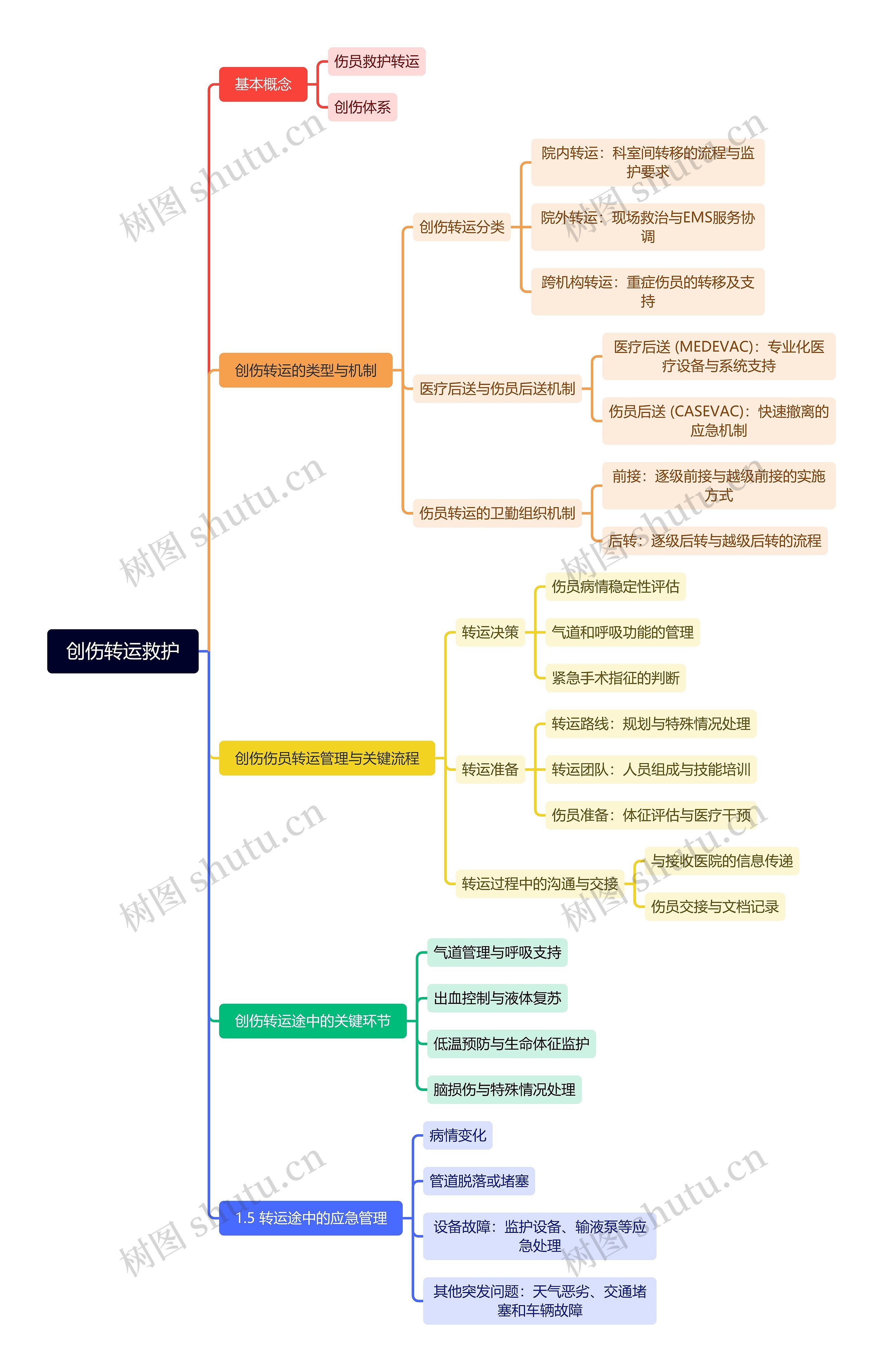 树图思维导图提供《创伤转运救护》在线思维导图免费制作,点击“编辑”按钮,可对《创伤转运救护》进行在线思维导图编辑,本思维导图属于思维导图模板主题,文件编号是:d8e134fd5cfdc38a84adce758b2d21f5